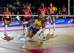 (250823) -- CHIANG MAI, 23 agosto, 2025 (Xinhua) -- María Alejandra Marín (frente), de Colombia, intenta salvar el balón durante el partido del grupo F de la fase preliminar entre República Dominicana y Colombia, en el Campeonato Mundial de Voleibol Femenino, en Chiang Mai, Tailandia, el 23 de agosto de 2025. (Xinhua/Hou Zhaokang) (rtg) (da)
