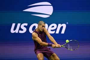 (250826) -- NUEVA YORK, 26 agosto, 2025 (Xinhua) -- Imagen del 25 de agosto de 2025 de Carlos Alcaraz, de España, devolviendo la pelota durante el partido de primera ronda de individuales masculinos, ante Reilly Opelka, de Estados Unidos, en el campeonato de tenis US Open 2025, en Nueva York, Estados Unidos. (Xinhua/Li Rui) (oa) (ah) (vf)