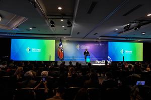 (250826) -- SANTIAGO, 26 agosto, 2025 (Xinhua) -- El presidente chileno, Gabriel Boric (c-atrás), pronuncia un discurso durante la inauguración de Enexpro 2025 "Diversifica tu mercado", en Santiago, capital de Chile, el 26 de agosto de 2025. (Xinhua/Jorge Villegas) (jv) (jg) (ra) (vf)