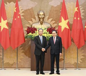 (250902) -- HANOI, 2 septiembre, 2025 (Xinhua) -- Zhao Leji, miembro del Comité Permanente del Buró Político del Comité Central del Partido Comunista de China (PCCh) y presidente del Comité Permanente de la Asamblea Popular Nacional (APN), sostiene conversaciones con el presidente de la Asamblea Nacional de Vietnam, Tran Thanh Man, en Hanoi, Vietnam, el 31 de agosto de 2025. Por invitación del Comité Central del Partido Comunista de Vietnam (PCV) y del presidente de la Asamblea Nacional, Tran Thanh Man, Zhao encabezó una delegación del Partido y del Gobierno para una visita a Vietnam, durante la cual también se reunió por separado con el secretario general del Comité Central del PCV, To Lam, el presidente vietnamita, Luong Cuong, y el primer ministro, Pham Minh Chinh, sostuvo conversaciones con Tran Thanh Man y asistió a los eventos para conmemorar el 80º aniversario de la Revolución de Agosto y el Día Nacional de la República Socialista de Vietnam de domingo a martes. (Xinhua/Zhang Ling) (jg) (ra) (ce)