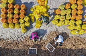 (250911) — BEIJING, 11 septiembre, 2025 (Xinhua) — Vista aérea tomada con un dron el 8 de septiembre de 2025 de aldeanos aireando nueces en un patio, en la ciudad de Zunhua, en la provincia de Hebei, en el norte de China. (Xinhua/Liu Mancang) (da) (ra) (ce)