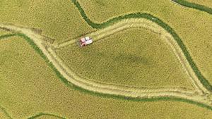 (250911) -- BEIJING, 11 septiembre, 2025 (Xinhua) -- Vista aérea tomada con un dron de una cosechadora trabajando en un campo, en el poblado de Wangcao del distrito de Suiyang, en la provincia de Guizhou, en el suroeste de China, el 11 de septiembre de 2025. (Xinhua/Li Qianyong) (da) (ra) (ce)