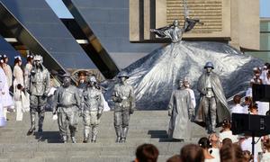 (250914) -- MINSK, 14 septiembre, 2025 (Xinhua) -- Imagen del 13 de septiembre de 2025 de actores realizando una presentación en una celebración, en Minsk, Bielorrusia. Una serie de eventos se llevaron a cabo en Minsk el sábado para conmemorar el 958 aniversario de la fundación de la ciudad. (Xinhua/Henadz Zhinkov) (oa) (ah)