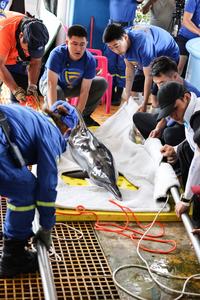 (250914) -- WANNING, 14 septiembre, 2025 (Xinhua) -- Rescatistas trasladan al delfín "Wan Wan" en una camilla en una instalación de rescate, en Lingshui, en la provincia de Hainan, en el sur de China, el 14 de septiembre de 2025. "Wan Wan", el delfín varado rescatado en Wanning en junio, fue liberado de vuelta al mar el domingo, después de tres meses de cuidado de rehabilitación y tratamiento por un grupo local de expertos. (Xinhua/Zhang Liyun) (rtg) (ah)
