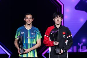(250914) -- MACAO, 14 septiembre, 2025 (Xinhua) -- Wang Chuqin (d), de China y Hugo Calderano, de Brasil, posan durante la entrega de trofeos al término de la final de individuales masculinos entre Wang Chuqin, de China, y Hugo Calderano, de Brasil, en el Campeonato Mundial de Tenis de Mesa (WTT) Macao 2025, en Macao, en el sur de China, el 14 de septiembre de 2025. (Xinhua/Cheong Kam Ka) (oa) (ah)