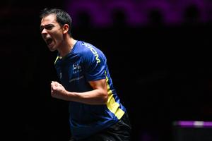 (250914) -- MACAO, 14 septiembre, 2025 (Xinhua) -- Hugo Calderano, de Brasil, festeja un punto durante la semifinal de individuales masculinos ante Anders Lind, de Dinamarca, en el Campeonato Mundial de Tenis de Mesa (WTT) Macao 2025, en Macao, en el sur de China, el 14 de septiembre de 2025. (Xinhua/Cheong Kam Ka) (oa) (ah)