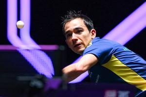 (250914) — MACAO, 14 septiembre, 2025 (Xinhua) — Hugo Calderano, de Brasil, devuelve la pelota durante la semifinal de individuales masculinos ante Anders Lind, de Dinamarca, en el Campeonato Mundial de Tenis de Mesa (WTT) Macao 2025, en Macao, en el sur de China, el 14 de septiembre de 2025. (Xinhua/Cheong Kam Ka) (oa) (ah)