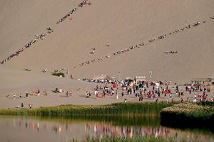 (250914) -- BEIJING, 14 septiembre, 2025 (Xinhua) -- Imagen del 13 de septiembre de 2025 de turistas visitando el punto escénico de la Montaña Mingsha y el Manantial de la Luna Creciente, en la ciudad de Dunhuang, en la provincia de Gansu, en el noroeste de China. Personas de todo el país disfrutan del paisaje otoñal de diversas maneras durante el fin de semana. (Xinhua/Zhang Xiaoliang) (oa) (ah)