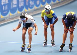 (250914) -- QINHUANGDAO, 14 septiembre, 2025 (Xinhua) -- Kang Byungho (i), de República de Corea, festeja al término de la final masculina junior por eliminación de 10000 m en el Campeonato Mundial de Patinaje de Velocidad 2025, en el distrito de Beidaihe de Qinhuangdao, en la provincia de Hebei, en el norte de China, el 14 de septiembre de 2025. (Xinhua/Yang Shiyao) (rtg) (ah)