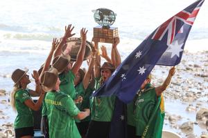(250914) -- LA LIBERTAD, 14 septiembre, 2025 (Xinhua) -- Surfistas de la selección de Australia, festejan con los trofeos de primer lugar por equipos, durante las finales de los Juegos Mundiales de Surf El Salvador 2025, organizados por la Asociación Internacional de Surf (ISA, por sus siglas en inglés), en la playa El Tunco, en el departamento de La Libertad, El Salvador, el 14 de septiembre de 2025. (Xinhua/Alexander Peña) (ap) (rtg) (ah)