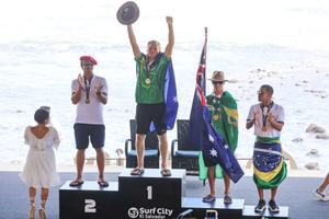 (250914) -- LA LIBERTAD, 14 septiembre, 2025 (Xinhua) -- Dane Henry (c), de Australia, festeja después de obtener el primer lugar, junto a Kauli Vaast (2-d), de Francia, Morgan Cibilic (2-d), de Australia y Douglas Silva (i), de Brasil, durante las finales de los Juegos Mundiales de Surf El Salvador 2025, organizados por la Asociación Internacional de Surf (ISA, por sus siglas en inglés), en la playa El Tunco, en el departamento de La Libertad, El Salvador, el 14 de septiembre de 2025. (Xinhua/Alexander Peña) (ap) (rtg) (ah)