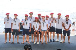 (250914) -- LA LIBERTAD, 14 septiembre, 2025 (Xinhua) -- Surfistas de la selección de Francia, festejan con sus medallas de cuarto lugar por equipos, durante las finales de los Juegos Mundiales de Surf El Salvador 2025, organizados por la Asociación Internacional de Surf (ISA, por sus siglas en inglés), en la playa El Tunco, en el departamento de La Libertad, El Salvador, el 14 de septiembre de 2025. (Xinhua/Alexander Peña) (ap) (rtg) (ah)