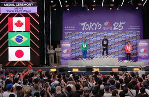 (250914) -- TOKIO, 14 septiembre, 2025 (Xinhua) -- El medallista de oro, Evan Dunfee (c), de Canadá, el medallista de plata, Caio Bonfim (i), de Brasil y el medallista de bronce, Katsuki Hayato, de Japón, asisten a la ceremonia de premiación del evento de 35 km de marcha masculina en el Campeonato Mundial de Atletismo 2025, en Tokio, Japón, el 14 de septiembre de 2025. (Xinhua/Ju Huanzong) (rtg) (ah)