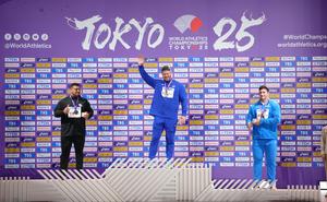 (250914) -- TOKIO, 14 septiembre, 2025 (Xinhua) -- El medallista de oro, Ryan Crouser (c), de Estados Unidos, el medallista de plata, Uziel Muñoz (i), de México y el medallista de bronce, Leonardo Fabbri, de Italia, reaccionan durante la ceremonia de premiación de lanzamiento de peso masculino en el Campeonato Mundial de Atletismo 2025, en Tokio, Japón, el 14 de septiembre de 2025. (Xinhua/Ju Huanzong) (rtg) (ah)