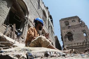 (250914) -- SANA, 14 septiembre, 2025 (Xinhua) -- Imagen del 13 de septiembre de 2025 de un hombre sentado cerca de edificios dañados por los ataques aéreos israelíes, en Saná, Yemen. El número de muertos por los ataques aéreos israelíes en la capital controlada por los hutíes de Yemen, Saná, y la provincia de al-Jawf el miércoles ha aumentado a 46, mientras otras 165 personas resultaron heridas, dijo el jueves el Ministerio de Salud hutí. (Xinhua/Mohammed Mohammed) (oa) (ah)