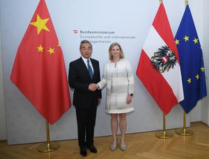 (250913) -- VIENA, 13 septiembre, 2025 (Xinhua) -- El ministro de Relaciones Exteriores chino, Wang Yi, también miembro del Buró Político del Comité Central del Partido Comunista de China, sostiene conversaciones con su homóloga de Austria, Beate Meinl-Reisinger, en Viena, Austria, el 12 de septiembre de 2025. (Xinhua/He Canling) (jg) (da)