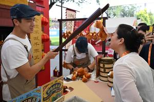 (250912) -- BEIJING, 12 septiembre, 2025 (Xinhua) -- Un expositor (i) presenta productos culturales y creativos de pato asado exhibidos en el estand de Quanjude, una marca consagrada por el pato de Peking, durante la Feria Internacional de Comercio de Servicios de China (CIFTIS, por sus siglas en inglés) 2025, en Beijing, capital de China, el 12 de septiembre de 2025. La CIFTIS 2025 se lleva a cabo del 10 al 14 de septiembre en el Parque Shougang en Beijing. La feria de este año presenta una amplia gama de productos culturales y creativos, muy populares entre los visitantes. (Xinhua/Sui Shangjun) (rtg) (ra) (vf)