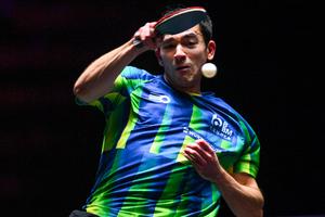 (250913) -- MACAO, 13 septiembre, 2025 (Xinhua) -- Hugo Calderano, de Brasil, compite durante el partido de cuartos de final de individuales masculinos ante Patrick Franziska, de Alemania, en el Campeonato Mundial de Tenis de Mesa (WTT) Macao 2025, en Macao, en el sur de China, el 13 de septiembre de 2025. (Xinhua/Cheong Kam Ka) (oa) (da)