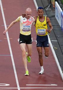 (250913) -- TOKIO, 13 septiembre, 2025 (Xinhua) -- Tim Van de Velde (i), de Bélgica, ayuda a Carlos San Martín, de Colombia, durante las eliminatorias de 3000 m obstáculos masculinos en el Campeonato Mundial de Atletismo 2025, en Tokio, Japón, el 13 de septiembre de 2025. (Xinhua/Ju Huanzong) (rtg) (da)