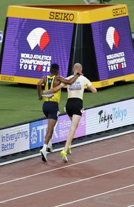 (250913) -- TOKIO, 13 septiembre, 2025 (Xinhua) -- Tim Van de Velde (d), de Bélgica, ayuda a Carlos San Martín, de Colombia, durante las eliminatorias de 3000 m obstáculos masculinos en el Campeonato Mundial de Atletismo 2025, en Tokio, Japón, el 13 de septiembre de 2025. (Xinhua/Wang Lili) (rtg) (da)