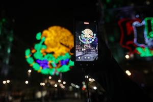 (250912) -- CIUDAD DE MÉXICO, 12 septiembre, 2025 (Xinhua) -- Imagen del 11 de septiembre de 2025 de un ciudadano tomando fotografías de las decoraciones luminosas para el próximo Día de la Independencia en la plaza del Zócalo, en la Ciudad de México, capital de México. México conmemorará el 16 de septiembre el 215 aniversario de su independencia. (Xinhua/Francisco Cañedo) (oa) (ra) (vf)