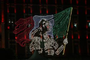 (250912) -- CIUDAD DE MÉXICO, 12 de septiembre de 2025 (Xinhua) -- Imagen del 11 de septiembre de 2025 de una decoración luminosa para el próximo Día de la Independencia en la plaza del Zócalo, en la Ciudad de México, capital de México. México conmemorará el 16 de septiembre el 215 aniversario de su independencia. (Xinhua/Francisco Cañedo) (oa) (ra) (vf)