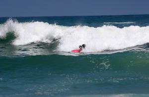 (250913) -- LIMA, 13 septiembre, 2025 (Xinhua) -- El perro Makakilo surfea en la playa San Bartolo, en el sur de Lima, Perú, el 13 de septiembre de 2025. (Xinhua/Mariana Bazo) (mb) (oa) (da)