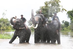 (250912) -- AYUTTHAYA, 12 septiembre, 2025 (Xinhua) -- Trabajadores bañan elefantes en un río junto a la Royal Elephant Kraal Village, en Ayutthaya, Tailandia, el 12 de septiembre de 2025. (Xinhua/Rachen Sageamsak) (oa) (ra) (vf)