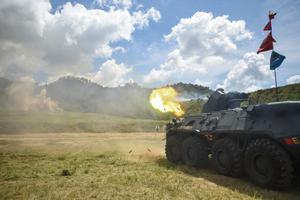 (250913) -- CARACAS, 13 septiembre, 2025 (Xinhua) -- Un vehículo blindado de la Fuerza Armada Nacional Bolivariana (FANB) realiza un ejercicio de tiro durante una jornada de adiestramiento en el Fuerte Tiuna, en Caracas, Venezuela, el 13 de septiembre de 2025. El presidente de Venezuela y comandante en jefe de la FANB, Nicolás Maduro, convocó el viernes una masiva jornada de adiestramiento en 312 cuarteles y unidades militares en todo el país. (Xinhua/Marcos Salgado) (ms) (oa) (da)