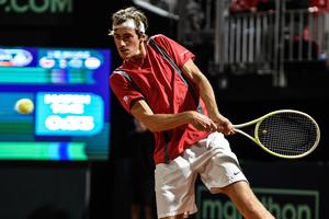 (250914) -- SANTIAGO, 14 septiembre, 2025 (Xinhua) -- Imagen del 13 de septiembre de 2025 de Alex Knaff, de Luxemburgo, devolviendo la pelota durante el partido individual correspondiente a las eliminatorias de la Copa Davis ante Tomás Barrios Vera, de Chile, celebrado en el Court Central Anita Lizana del Estadio Nacional de Chile, en Santiago, capital de Chile. (Xinhua/Jorge Villegas) (jv) (oa) (ah)