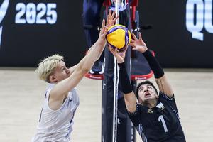 (250914) -- CIUDAD DE PASAY, 14 septiembre, 2025 (Xinhua) -- Matías Sánchez Pages (d), de Argentina, compite ante Luka Marttila, de Finlandia durante el partido del grupo C entre Finlandia y Argentina, en el Campeonato Mundial Masculino de la FIVB 2025, en la Ciudad de Pasay, Filipinas, el 14 de septiembre de 2025. (Xinhua/Rouelle Umali) (rtg) (ah)