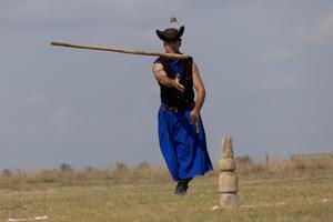 (250914) -- HORTOBAGY, 14 septiembre, 2025 (Xinhua) -- Imagen del 13 de septiembre de 2025 de un participante intentando golpear a un conejo de madera con un palo durante una competencia tradicional de pastores, en Hortobagy, Hungría. (Xinhua/Attila Volgyi) (oa) (ah)