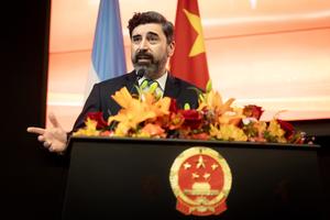 (250917) -- BUENOS AIRES, 17 septiembre, 2025 (Xinhua) -- Imagen del 16 de septiembre de 2025 del subsecretario de Política Exterior de la Cancillería argentina, Juan Manuel Navarro, hablando durante el acto en conmemoración del 76º aniversario de la fundación de la República Popular China, en la ciudad de Buenos Aires, capital de Argentina. La Embajada de China en Argentina celebró el martes en Buenos Aires el 76º aniversario de la fundación de la República Popular China, con la presencia de autoridades nacionales, provinciales y locales, de las Fuerzas Armadas y de Seguridad, y también del cuerpo diplomático acreditado ante el país sudamericano, junto con dirigentes de todo el arco político, además de académicos y representantes del ámbito empresarial y educativo. (Xinhua/Martín Zabala) (mz) (ah) (ce)