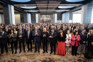 (250917) -- BUENOS AIRES, 17 septiembre, 2025 (Xinhua) -- Imagen del 16 de septiembre de 2025 del embajador de China en Argentina, Wang Wei (c-frente), el jefe del Gabinete de Ministros de Argentina, Guillermo Francos (c-i-frente) e invitados especiales, participando en el acto en conmemoración del 76º aniversario de la fundación de la República Popular China, en la ciudad de Buenos Aires, capital de Argentina. La Embajada de China en Argentina celebró el martes en Buenos Aires el 76º aniversario de la fundación de la República Popular China, con la presencia de autoridades nacionales, provinciales y locales, de las Fuerzas Armadas y de Seguridad, y también del cuerpo diplomático acreditado ante el país sudamericano, junto con dirigentes de todo el arco político, además de académicos y representantes del ámbito empresarial y educativo. (Xinhua/Martín Zabala) (mz) (ah) (ce)