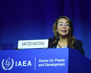 (250916) -- VIENA, 16 septiembre, 2025 (Xinhua) -- Imagen del 15 de septiembre de 2025 de Ghada Waly, directora general de la Oficina de las Naciones Unidas (ONU) en Viena, leyendo un mensaje del Secretario General de la ONU, António Guterres, en la 69 Conferencia General del Organismo Internacional de Energía Atómica (OIEA), en Viena, Austria. La conferencia fue inaugurada aquí el lunes, centrándose en el uso pacífico de la energía y la tecnología nucleares y en la urgente necesidad de proteger el régimen global de no proliferación nuclear. (Xinhua/He Canling) (jg) (ra) (vf)