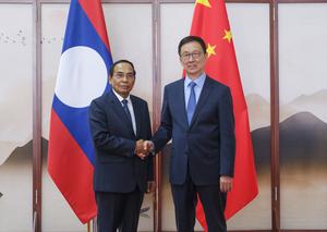 (250916) — NANNING, 16 septiembre, 2025 (Xinhua) — El vicepresidente chino, Han Zheng, se reúne con el vicepresidente de Laos, Bounthong Chitmany, quien se encuentra en China para asistir a la 22ª Exposición China-ASEAN y a la Cumbre de Negocios e Inversiones China-ASEAN, en Nanning, en la región autónoma de la etnia zhuang de Guangxi, en el sur de China, el 16 de septiembre de 2025. (Xinhua/Ding Lin) (jg) (ra) (ce)