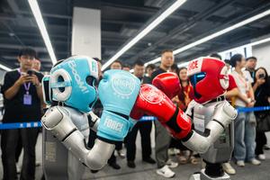(250915) -- CHANGSHA, 15 septiembre, 2025 (Xinhua) -- Visitantes observan un juego de boxeo de robots humanoides durante la Cumbre de Internet Yuelu 2025, en la Nueva Area de Xiangjiang de Changsha, capital de la provincia de Hunan, en el centro de China, el 15 de septiembre de 2025. Enfocándose en tecnologías de vanguardia como inteligencia artificial, la cumbre comenzó aquí el lunes. (Xinhua/Chen Sihan) (rtg) (ah) (ce)