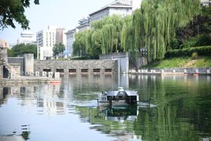 (250915) -- XI'AN, 15 septiembre, 2025 (Xinhua) -- Imagen del 2 de julio de 2024 de un bote de saneamiento inteligente trabajando en un foso escénico, en Xi'an, en la provincia de Shaanxi, en el noroeste de China. La antigua muralla de la ciudad, de 13,74 kilómetros de longitud que rodea Xi'an, es una de las más largas y mejor conservadas de su tipo en China. Una plataforma digital de gestión integral del muro se ha construido desde 2023, e integra funciones como la protección de reliquias culturales, la operación de turismo cultural, la gestión de emergencias y el comando de control de inundaciones. Mediante la aplicación integral de tecnologías avanzadas, como el análisis de macrodatos, Internet de las Cosas, etc., la plataforma brinda una fundación inteligente y digital para la protección de esta histórica ciudad. (Xinhua/Zhang Bowen) (rtg) (ah)