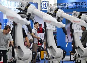 (250917) — TIANJIN, 17 septiembre, 2025 (Xinhua) — Personas aprenden sobre brazos robóticos en el Centro Nacional de Convenciones y Exposiciones (Tianjin), en la municipalidad de Tianjin, en el norte de China, el 17 de septiembre de 2025. La Exposición Internacional de Máquinas Herramienta de Tianjin comenzó el miércoles en el Centro Nacional de Convenciones y Exposiciones (Tianjin) y se extenderá hasta el 20 de septiembre. (Xinhua/Zhao Zishuo) (jg) (da) (vf)