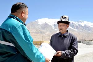(250916) -- URUMQI, 16 septiembre, 2025 (Xinhua) -- Imagen del 9 de septiembre de 2025 de un cartero (i) entregando un paquete a un aldeano, en la aldea de Bulungkol del municipio de Bulungkol, en el distrito de Akto, en la prefectura autónoma kirguís de Kizilsu, en la región autónoma uygur de Xinjiang, en el noroeste de China. En los últimos años, la sucursal de Xinjiang de China Post ha ampliado sus servicios postales a las comunidades locales de zonas remotas y puestos fronterizos. (Xinhua) (oa) (ah) (ce)