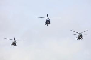 (250915) — SAN SALVADOR, 15 septiembre, 2025 (Xinhua) — Helicópteros de la Fuerza Aérea de El Salvador sobrevuelan el desfile por el 204 aniversario del Día de Independencia de El Salvador, en el departamento de San Salvador, capital de El Salvador, el 15 de septiembre de 2025. Miles de salvadoreños colmaron el lunes las calles de San Salvador, la capital, para conmemorar los 204 años de independencia de Centroamérica de España, en un desfile cívico militar que, pese a las lluvias nocturnas, inició puntualmente a las 8:00 hora local con un ambiente de música, color y orgullo nacional.(Xinhua/Alexander Peña) (ap) (rtg) (ah) (ce)