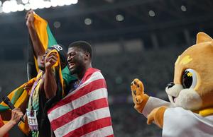 (250917) -- TOKIO, 17 septiembre, 2025 (Xinhua) -- Imagen del 16 de septiembre de 2025 del medallista de plata, Orlando Bennett (i), de Jamaica, reaccionando mientras el medallista de oro, Cordell Tinch (c), de Estados Unidos, concede una entrevista al término de la final de 110m con vallas masculinos, en el Campeonato Mundial de Atletismo de 2025, en Tokio, Japón. (Xinhua/Ju Huanzong) (jg) (da) (ce)
