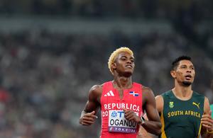 (250917) -- TOKIO, 17 septiembre, 2025 (Xinhua) -- Alexander Ogando (i), de República Dominicana, y Wayde Van Niekerk, de Sudáfrica, son vistos al término de las eliminatorias de 200m masculinos, en el Campeonato Mundial de Atletismo de 2025, en Tokio, Japón, el 17 de septiembre de 2025. (Xinhua/Jiang Han) (ah) (vf)