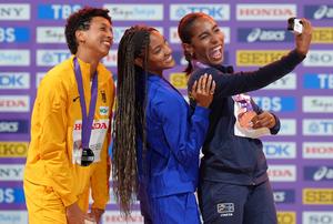 (250915) -- TOKIO, 15 septiembre, 2025 (Xinhua) -- La medallista de oro, Tara Davis-Woodhall (c), de Estados Unidos, la medallista de plata, Malaika Mihambo (i), de Alemania, y la medallista de bronce, Natalia Linares, de Colombia, se toman una fotografía durante la ceremonia de premiación de salto de longitud femenino, en el Campeonato Mundial de Atletismo 2025, en Tokio, Japón, el 15 de septiembre de 2025. (Xinhua/Ju Huanzong) (rtg) (ah) (ce)