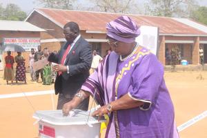(250917) -- GOLIATI, 17 septiembre, 2025 (Xinhua) -- Imagen del 16 de septiembre de 2025 de la expresidenta de Malaui, Joyce Banda, emitiendo su voto en un centro de votación, en Goliati, en el distrito de Thyolo, en el sur de Malaui. El tan esperado ejercicio de votación comenzó a las 6:00 (hora local) del martes y en los centros de votación de todo el país se formaron largas filas. (Xinhua/Albert Phiri) (jg) (da) (vf)