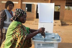 (250916) -- LILONGÜE, 16 septiembre, 2025 (Xinhua) -- Una mujer emite su voto en un centro de votación, en Lilongüe, Malaui, el 16 de septiembre de 2025. Los electores en Malaui están acudiendo a las urnas para elegir al presidente, representantes parlamentarios y líderes de gobiernos locales. (Xinhua/Roy Nkosi) (jg) (ra) (ce)