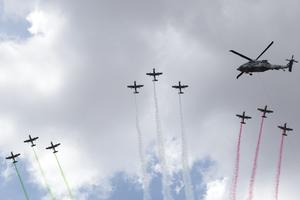 (250916) — CIUDAD DE MEXICO, 16 septiembre, 2025 (Xinhua) — Aviones militares vuelan en formación durante el Desfile Cívico Militar en conmemoración del 215 aniversario de la Independencia de México, en la Ciudad de México, capital de México, el 16 de septiembre de 2025. México celebró el martes el aniversario 215 del inicio de la lucha independentista contra el colonialismo español con la realización del tradicional Desfile Cívico Militar en la Ciudad de México, con la particularidad de que por primera ocasión se presentaron honores y se rindió el parte de novedades a una mujer, Claudia Sheinbaum, primera presidenta y comandanta suprema de las Fuerzas Armadas del país latinoamericano. (Xinhua/Francisco Cañedo) (fc) (oa) (ah) (ce)