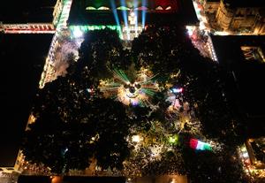 (250916) — OAXACA, 16 septiembre, 2025 (Xinhua) — Vista aérea tomada con un dron el 15 de septiembre de 2025 de personas asistiendo a la ceremonia del “Grito de Dolores” para celebrar el Día de la Independencia de México, en la plaza del Zócalo, en la ciudad de Oaxaca, en el estado de Oaxaca, México. México celebra su Día de la Independencia el 16 de septiembre. (Xinhua/Li Mengxin) (oa) (ah) (vf)
