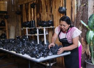 (250915) — OAXACA, 15 septiembre, 2025 (Xinhua) — Imagen del 14 de septiembre de 2025 de una artesana ordenando piezas de cerámica negra en un taller, en San Bartolo Coyotepec, en el estado de Oaxaca, México. En San Bartolo Coyotepec, la tradición de la cerámica negra es antigua y reconocida. (Xinhua/Li Mengxin) (oa) (ah) (ce)