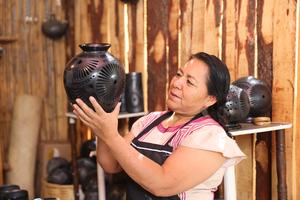 (250915) — OAXACA, 15 septiembre, 2025 (Xinhua) — Imagen del 14 de septiembre de 2025 de una artesana revisando una pieza de cerámica negra en un taller, en San Bartolo Coyotepec, en el estado de Oaxaca, México. En San Bartolo Coyotepec, la tradición de la cerámica negra es antigua y reconocida. (Xinhua/Li Mengxin) (oa) (ah) (ce)